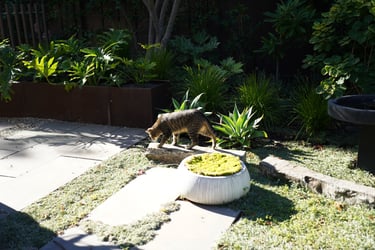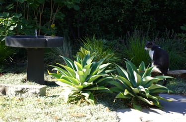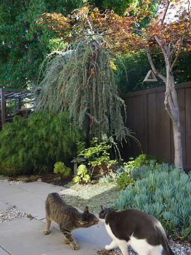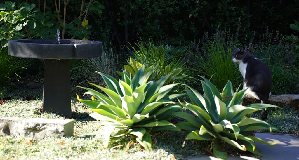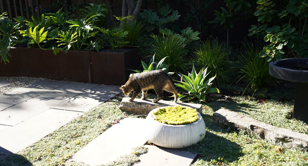 The rear yard features linear pavers that blend into groundcover, with basalt columns placed among dense plantings. A birdbath fountain attracts wildlife and forms the main view from the living room, while also serving as a playful hideaway for the cats.