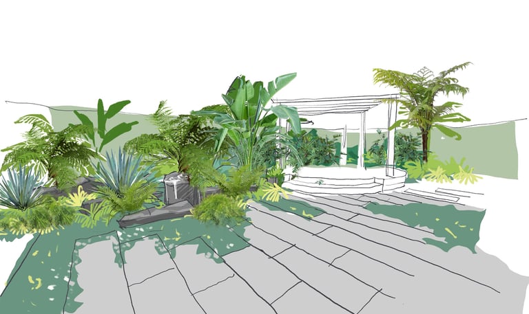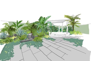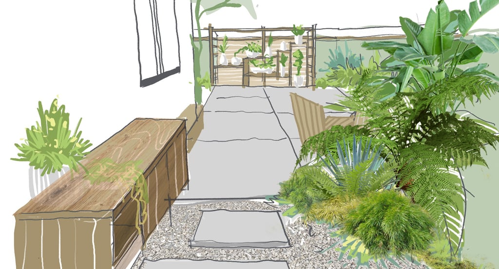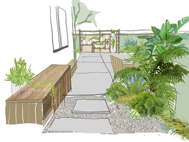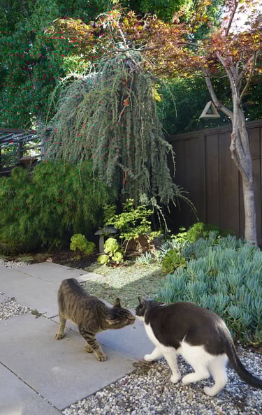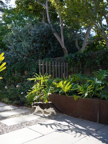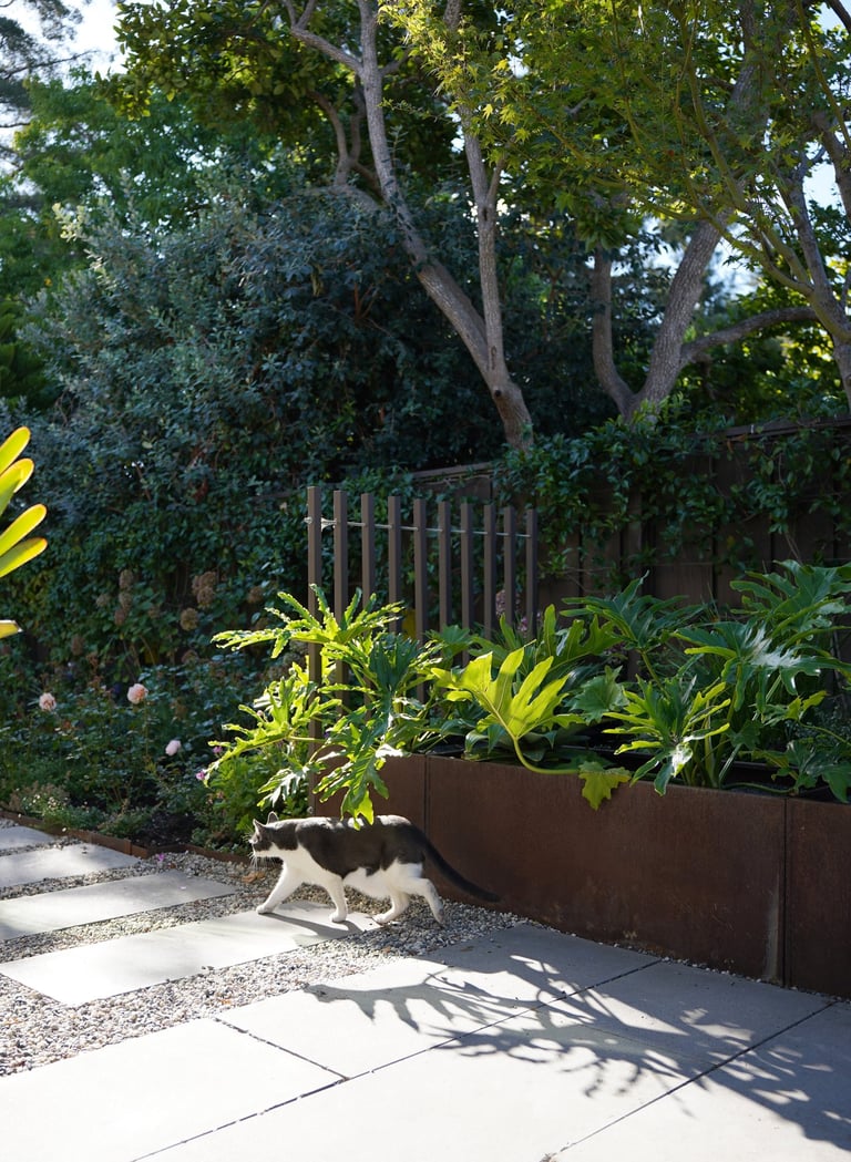 This courtyard renovation in Palo Alto creates a lush and inviting outdoor retreat for a family and their three cats. The design divides the small site into distinct zones, each with its own planting theme and material palette.