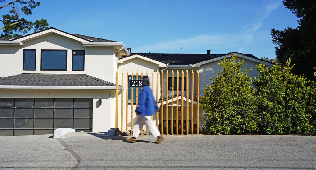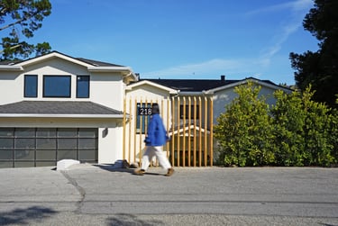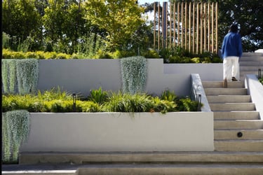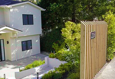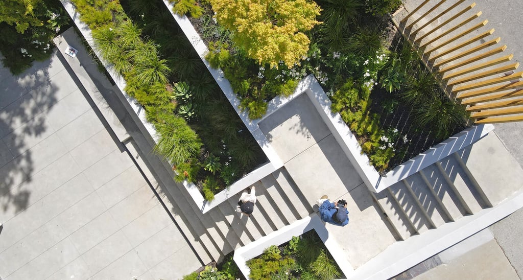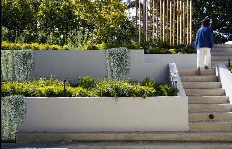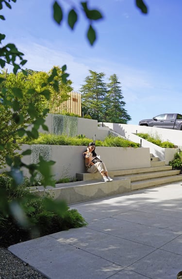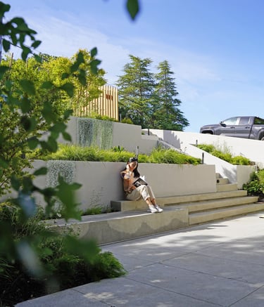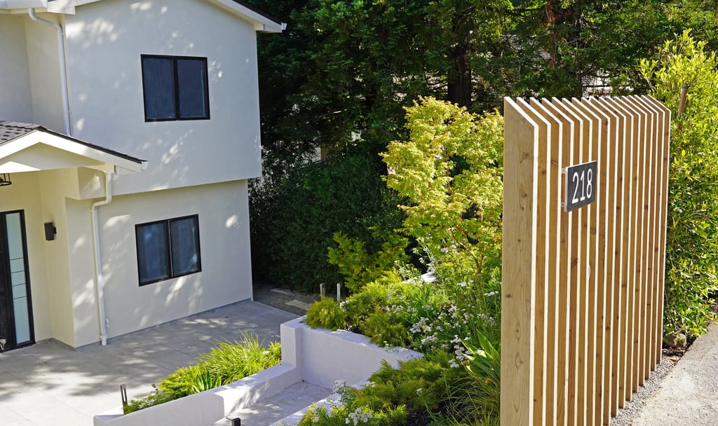 Located on a sloped site, the house features an entry garden that addresses a significant elevation change between the street and the main building. The design takes advantage of the topography by creating a terraced garden that guides visitors from the higher street level down to a series of sunken patios in front of the residence. A wood screening fence and a row of hedge trees provide privacy at the entry while maintaining visual transparency from the street. The integrated steps are seamlessly woven into the garden terraces, offering an immersive experience as one descends through layers of plantings.