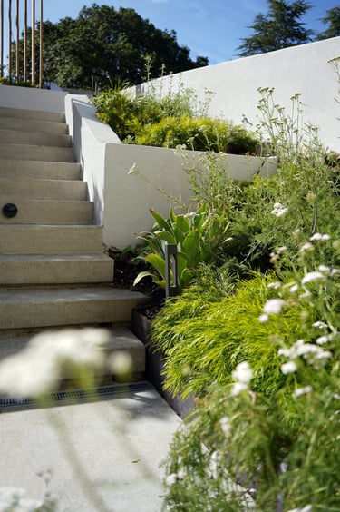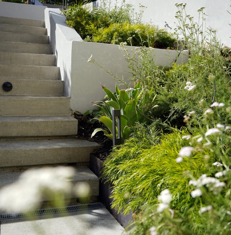 From the main entry below, the view reveals a lush, green terrace garden composed of Japanese maple trees, ornamental grasses, and a variety of textured shrubs—offering a rich and tranquil welcome to the home.
